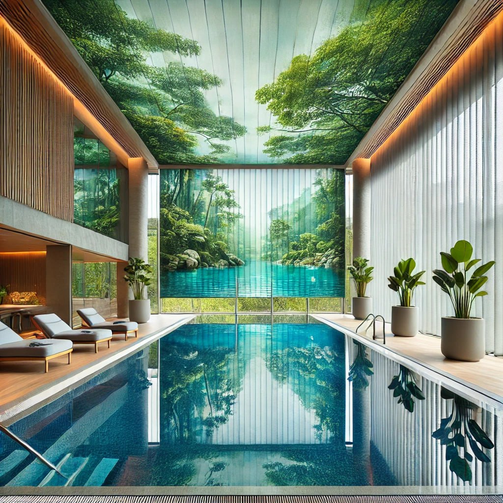- پردهای بزرگ و شفاف که از سقف آویزان شده و بر روی پنجره یا دیوارهای شیشهای استخر نصب شده است.